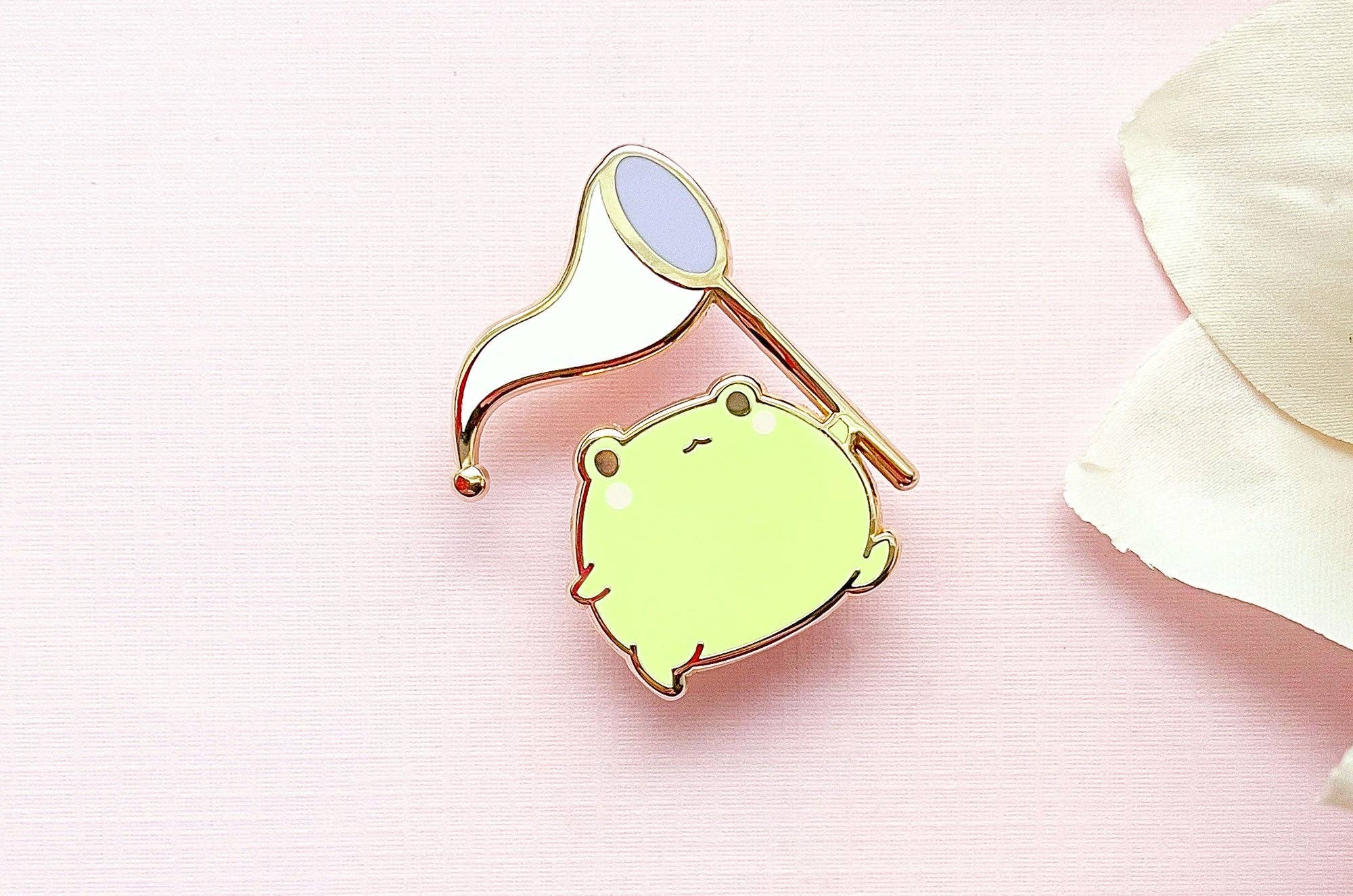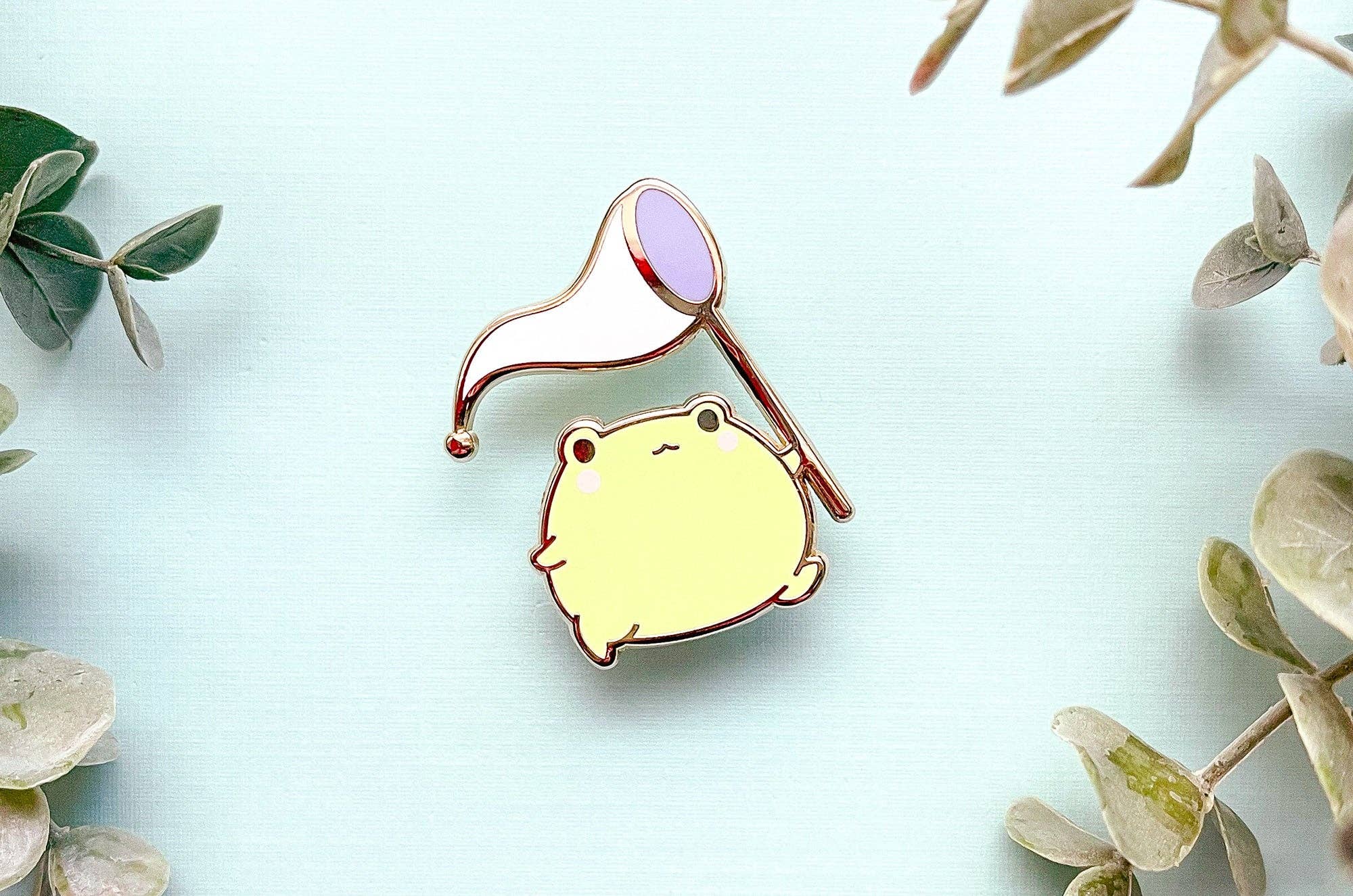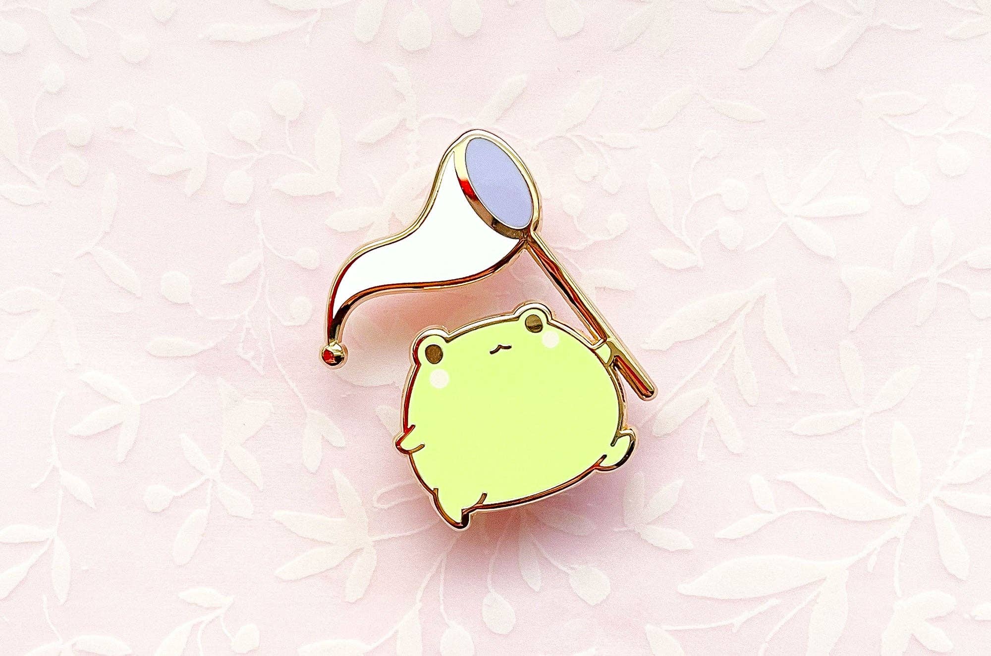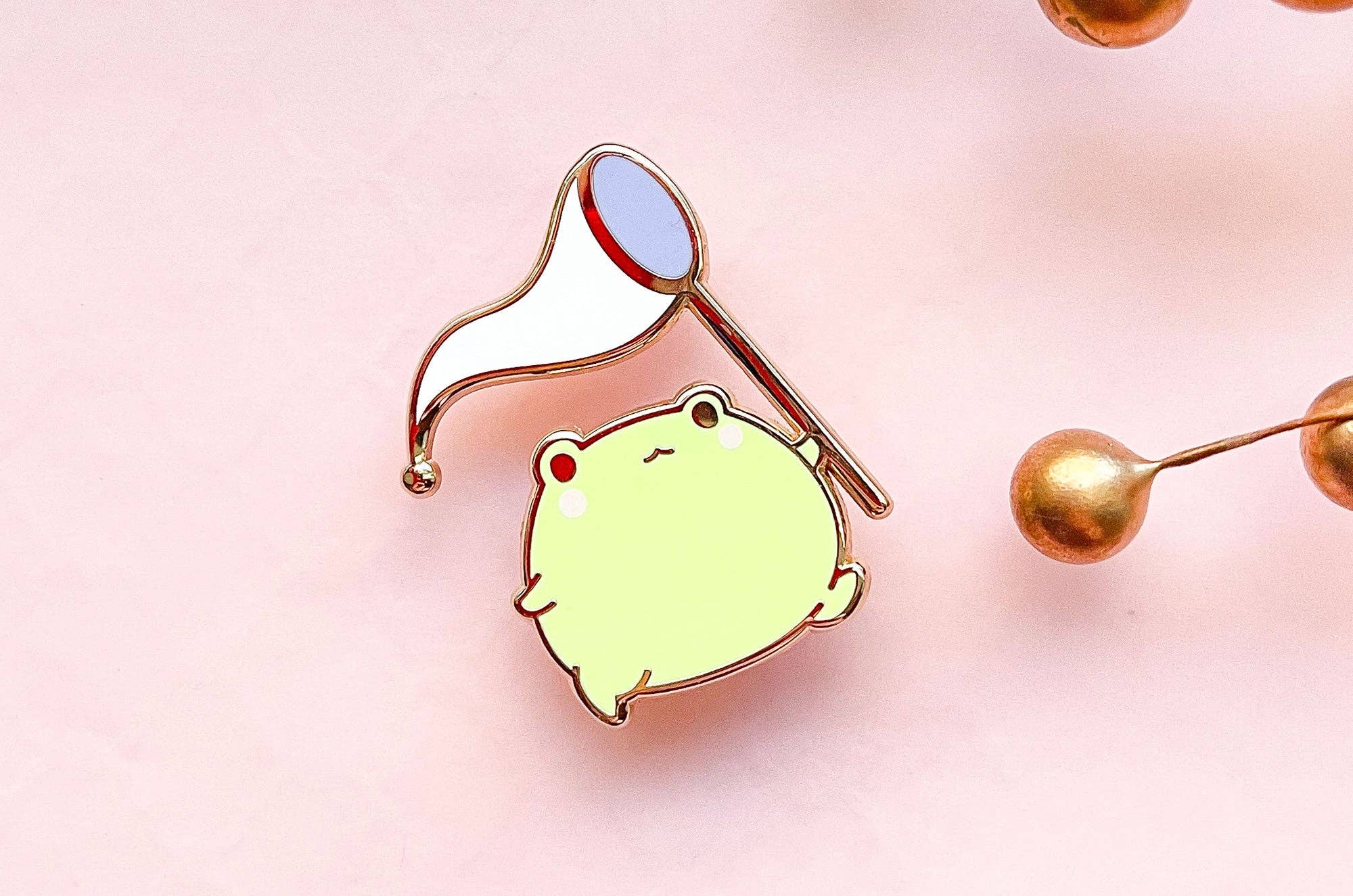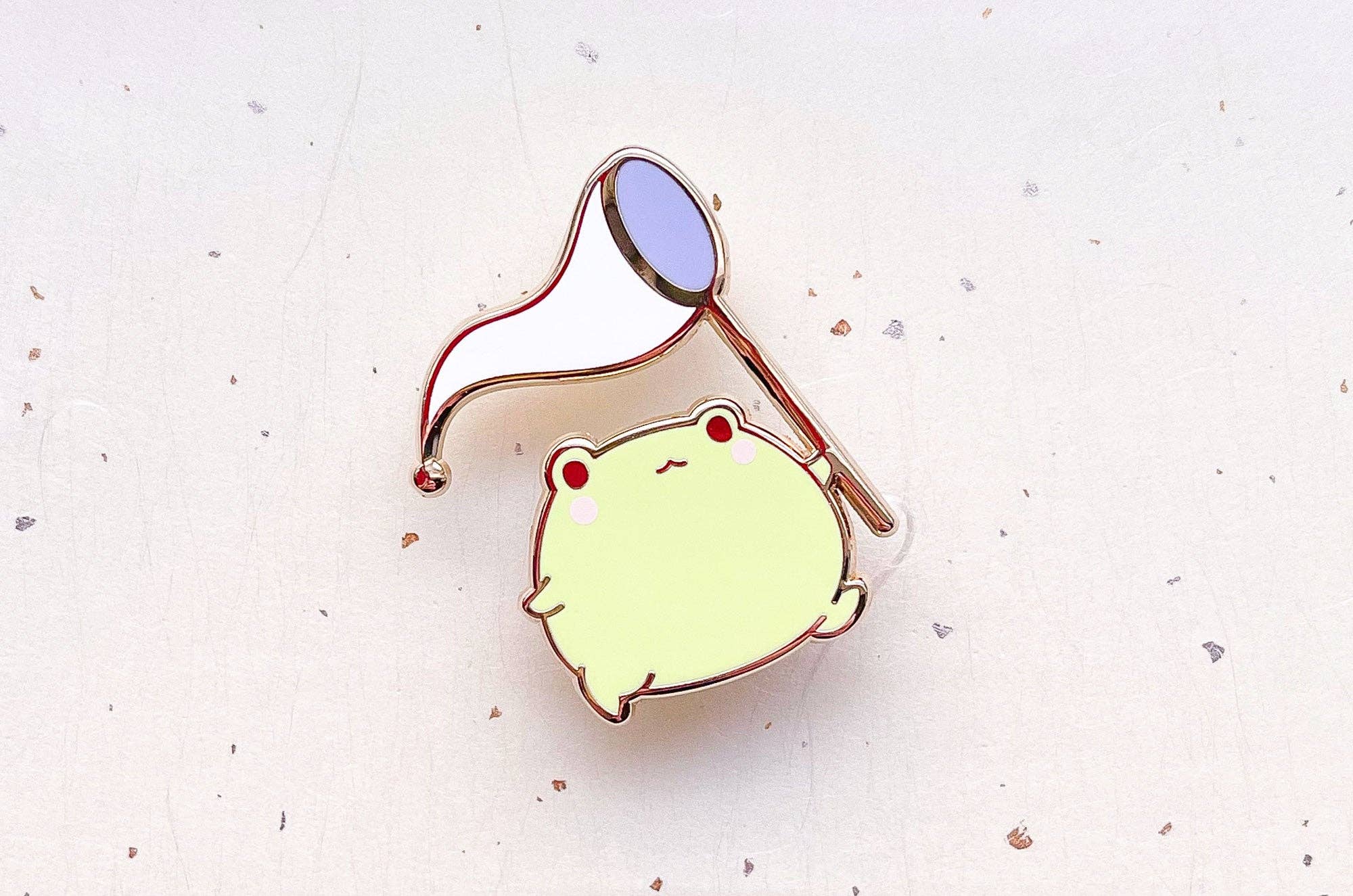 This cute Gogo the Frog and Butterfly Net enamel pin features my Gogo the Frog character running with a butterfly net in his hand. This hard enamel pin is set on a highly-polished gold-plated metal with two posts on the back and measures around 1.5".