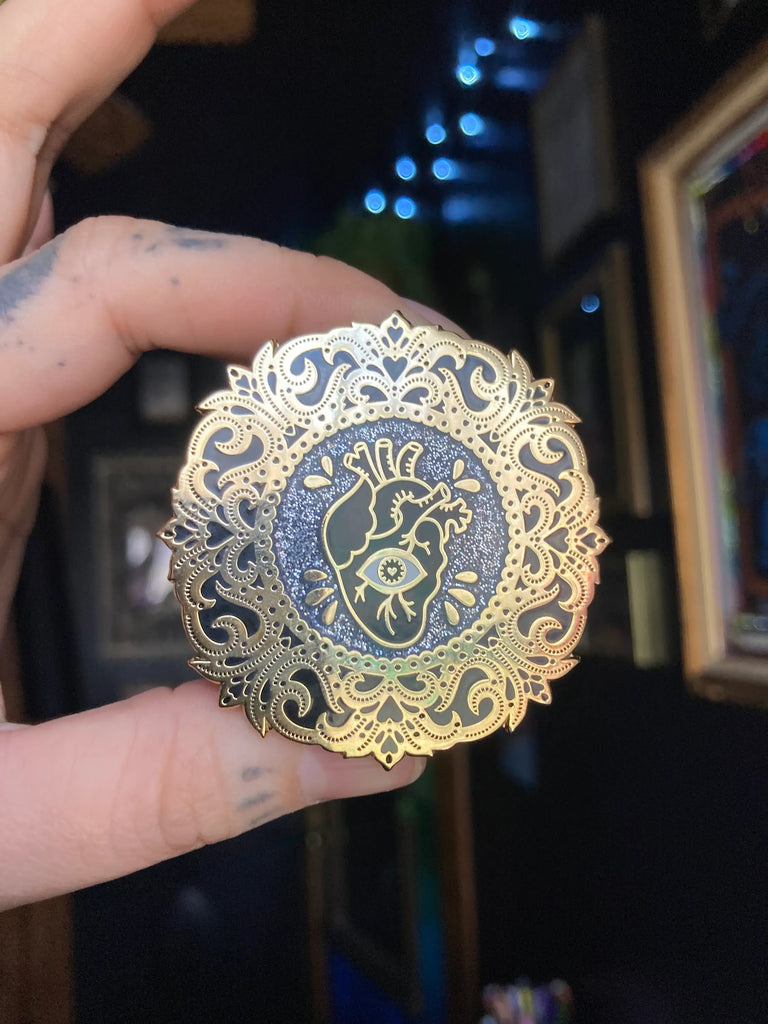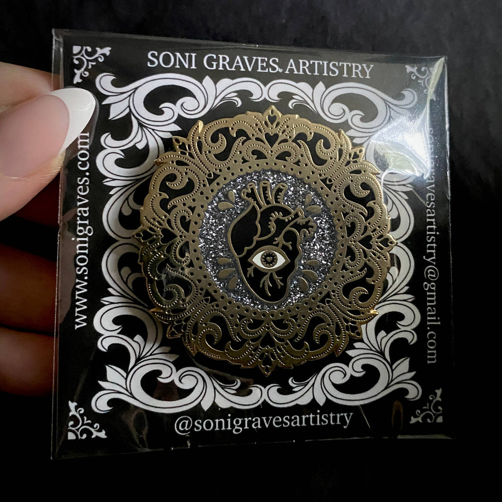 Gothic and spooky! Ornate gold filigree frame with crying eye/bleeding heart in black (with glitter background): -Measures 2 inches by 2 inches -Hard enamel pin with gold colored metal details. -Two pin backs with rubber clutch. -Perfect for those with a sensitive heart & soul. -Comes packaged individually wrapped, with branded backing inside clear protective sleeve. (Colors may appear differently depending on computer monitors or lighting of photo) Designed by Soni Graves