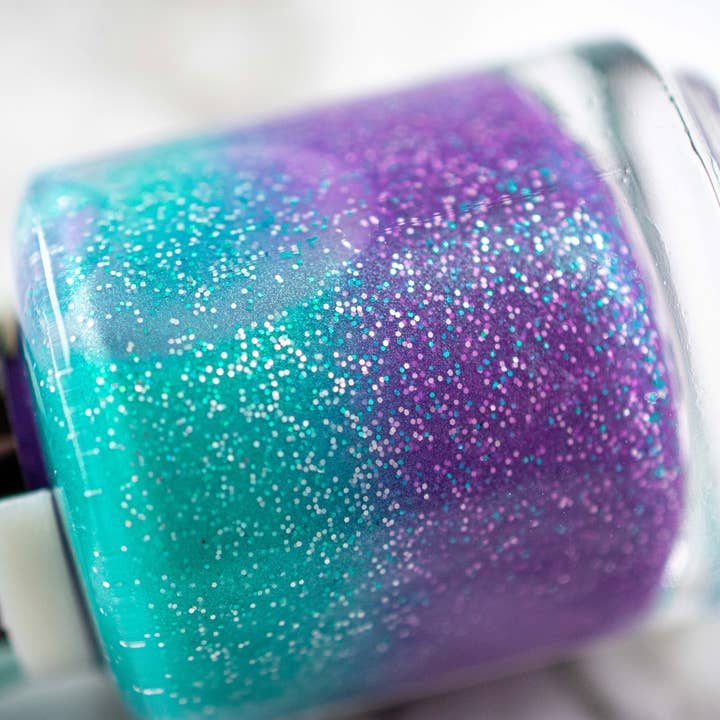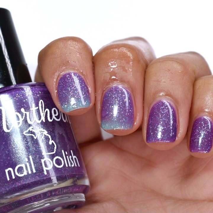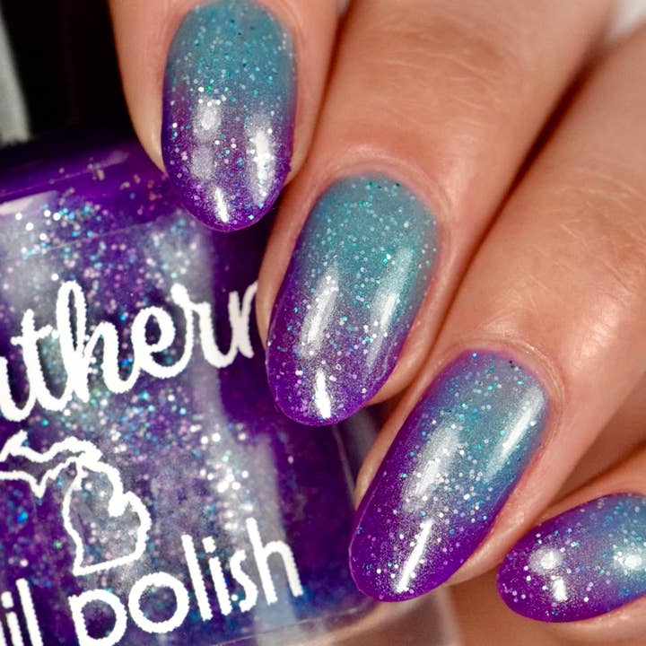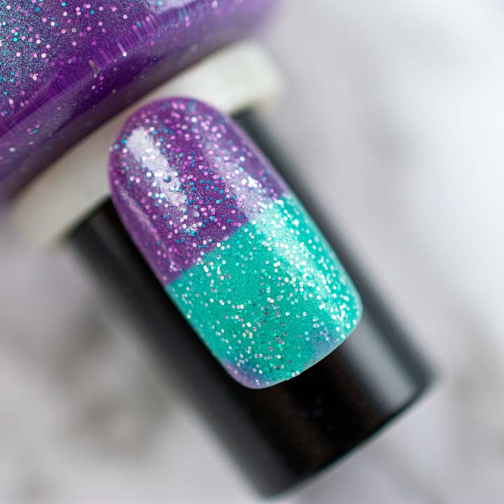 You Grow, Girl: Changes Color in temperatures! In the cold state, it is purple with a distinct aqua shimmer! In the warm state, the polish lightens up to a vibrant turquoise! In all temperatures the fun holographic teal and silver glitters show through and sparkle so much.