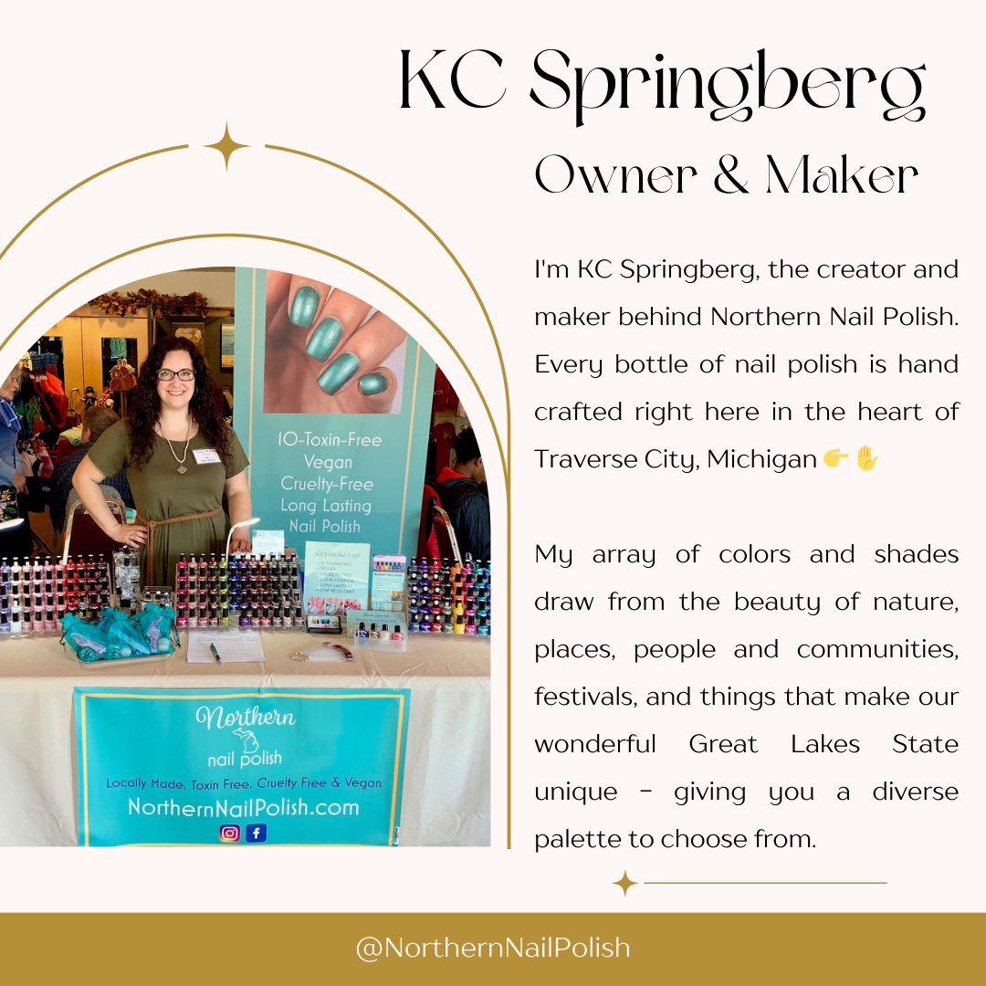 Northern Nail Polish: ~ Non-toxic ~ Natural, Vegan Ingredients ~ Cruelty-Free Formula ~ Chip-resistant & Long Lasting ~ Non-staining, Easily Removed ~ Great Customer Service ~ Handmade in Michigan ~ Woman-owned