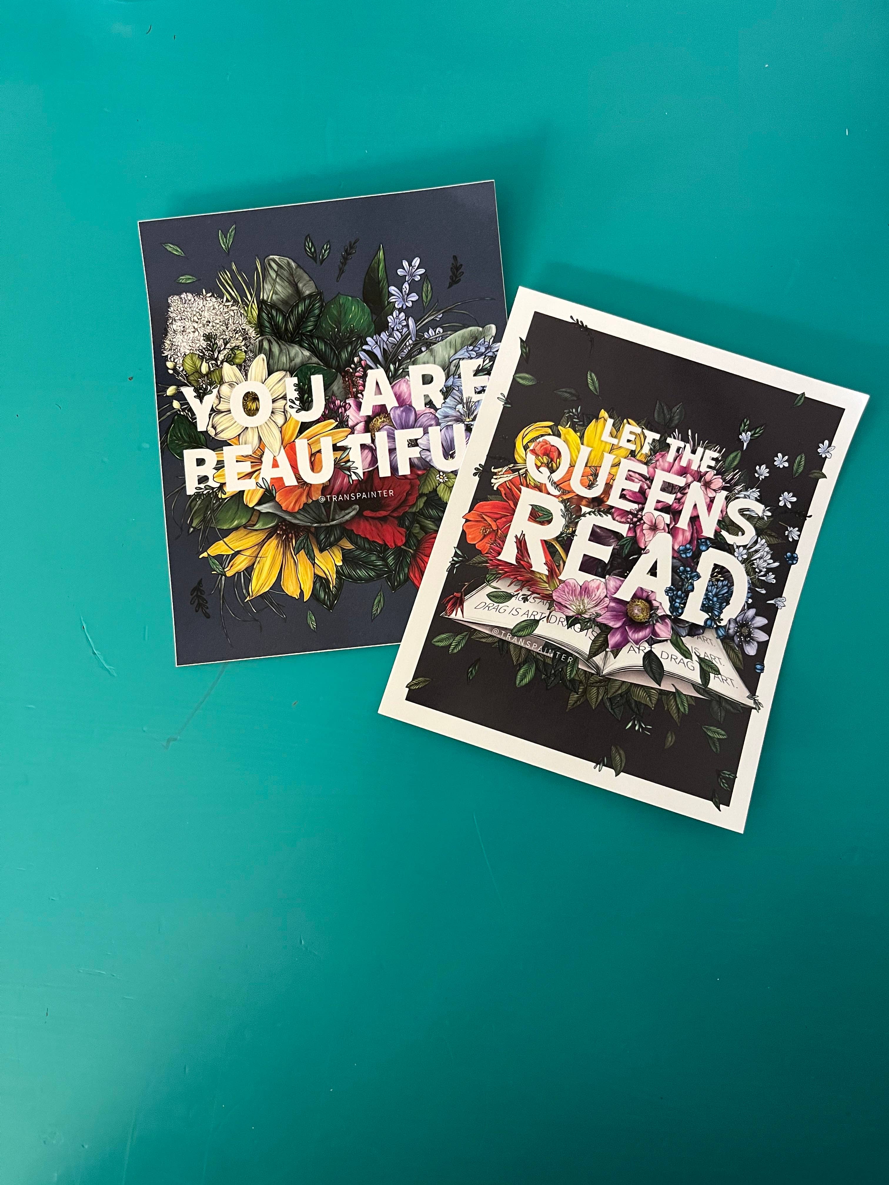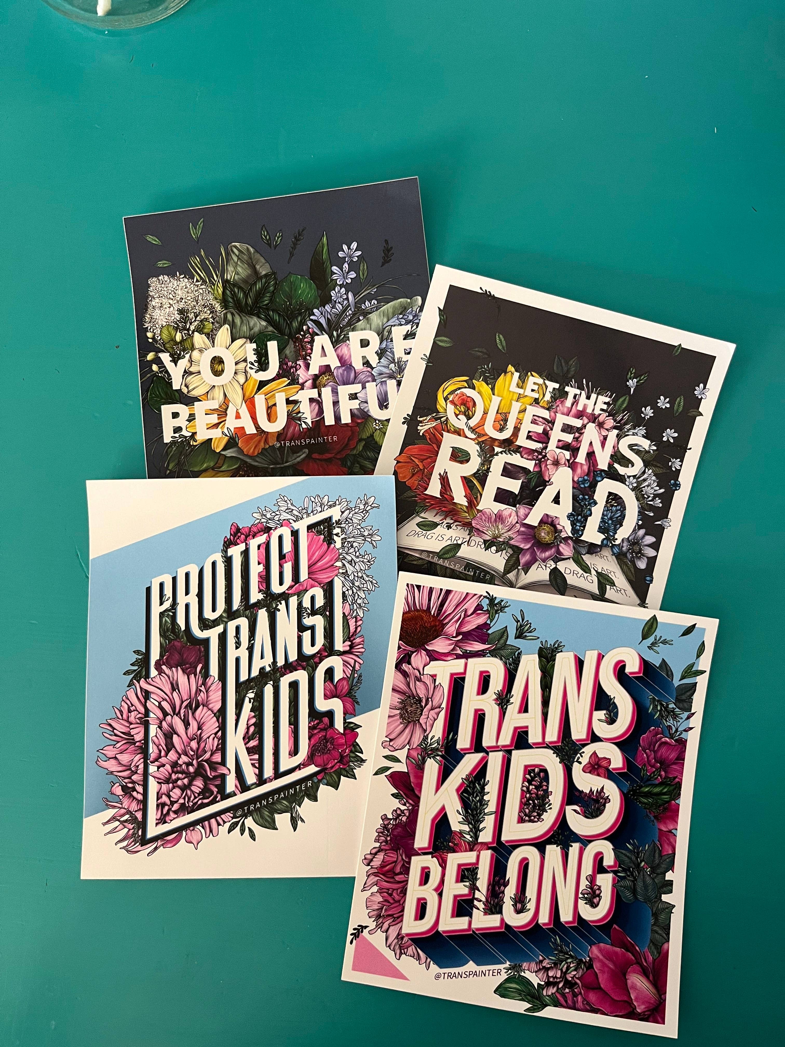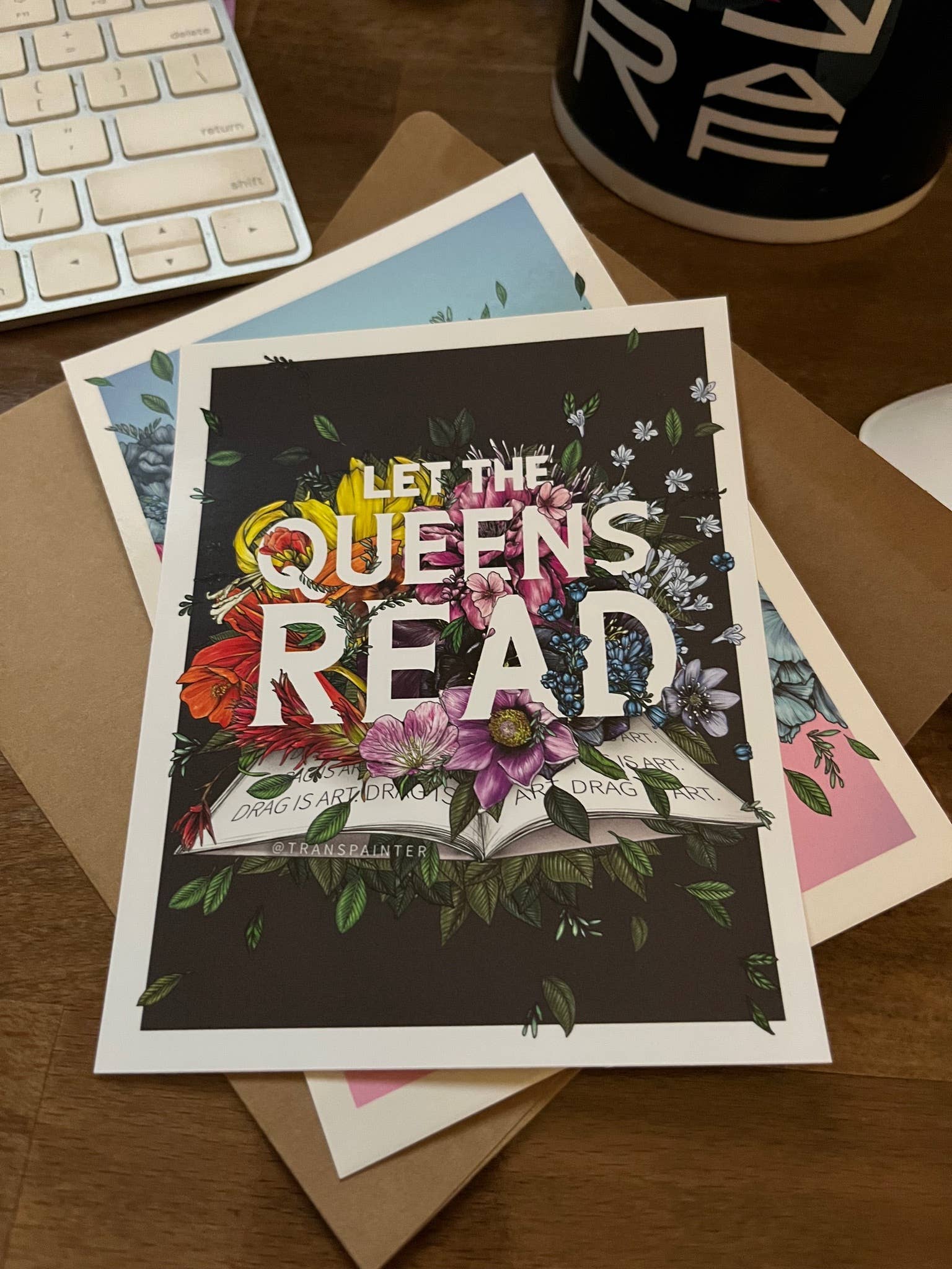 4x5 in bumper sticker art by Rae Senarghi (aka @transpainter) stickers that read "Let the Queens Read" on a black background surrounded by rainbow florals inspired by the LGBTQ+ pride flag over a book to honor the importance of drag as an art form and our love of drag queen story hours. Each sticker is printed on a thick, durable vinyl with a matte finish-giving your stickers a premium look & feel. These are bumper-sticker quality decals that should hold up to the bump and grind of your big beautiful daily life. VINYL BUMPER STICKER DETAILS: + Square: 4x4 in flat vinyl sticker + Rectangle: 4x5 in flat vinyl sticker + Die-Cut: approximately 4x4 in vinyl sticker + Typical full-time outdoor full vibrancy life is 3-9 months (depending on conditions in your location) CARE INSTRUCTIONS: For best results install stickers on clean, dry, flat non-porous surfaces. Store in dry locations out of direct sunlight for longer lasting color. Appreciate the message on this sticker each time you see it. Breathe it in. Then