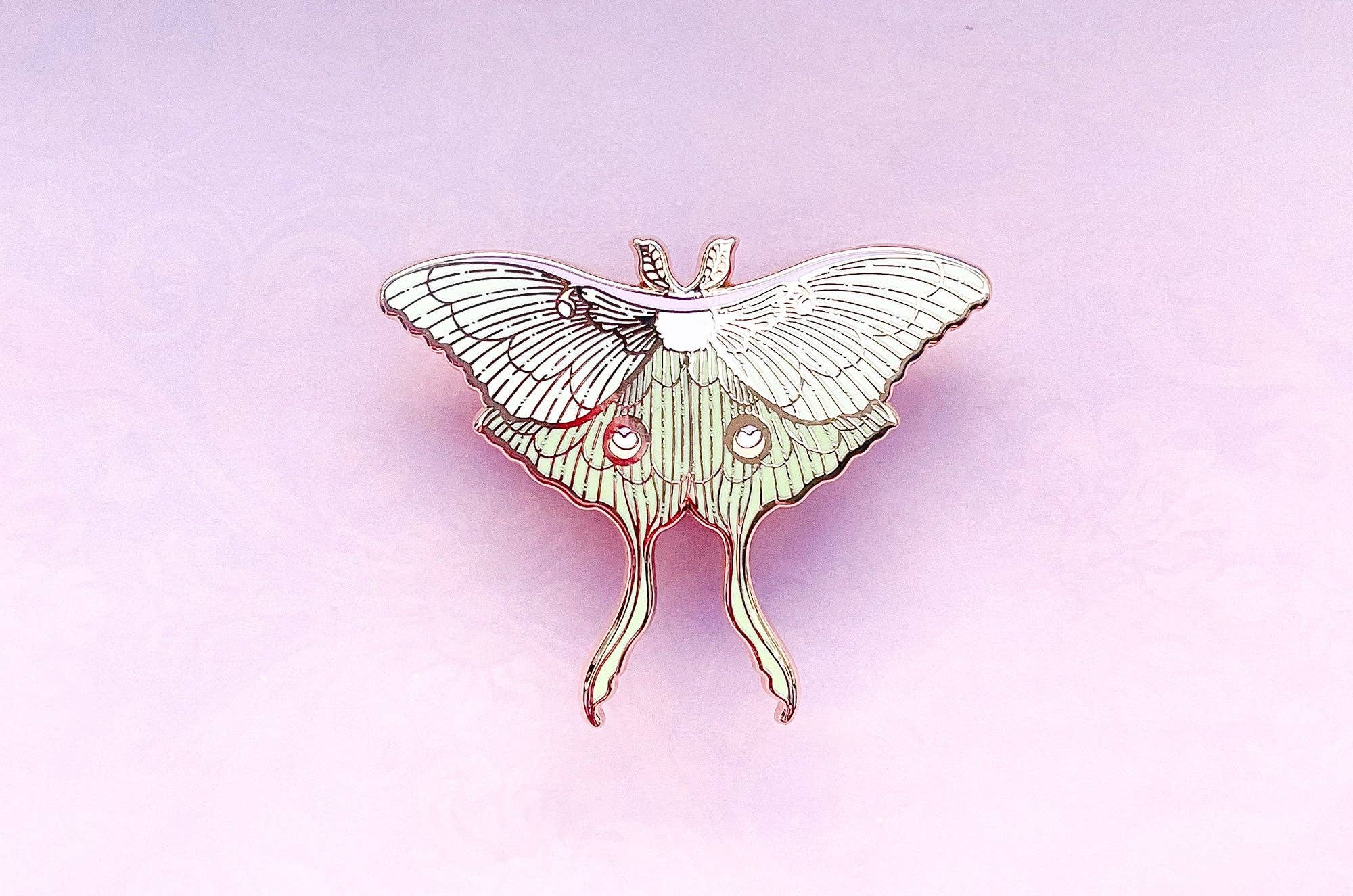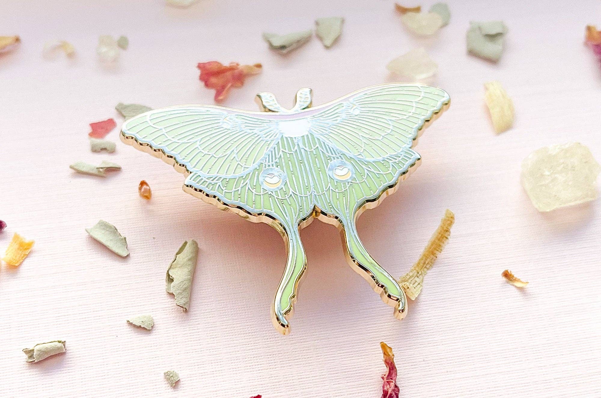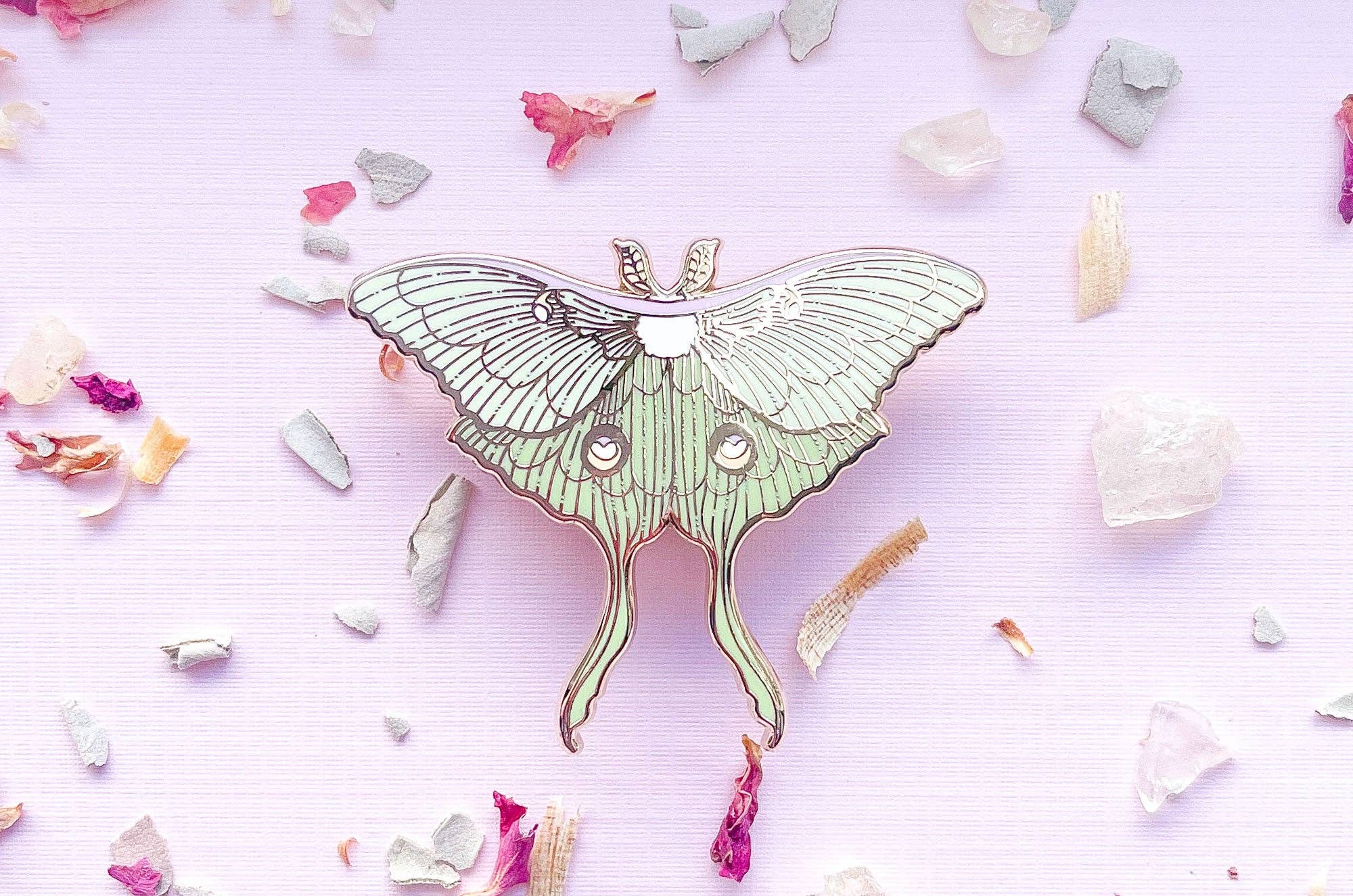 This gorgeous Luna Moth enamel pin features the beautiful insect also known as the American Moon Moth or Actias luna. These moths can be found in North America from the United States to Canada. This hard enamel pin is 2.0" from tip to tip and features a beautiful palette of green, purple and white. This hard enamel pin is set on a highly-polished gold-plated metal and has two posts on the back.