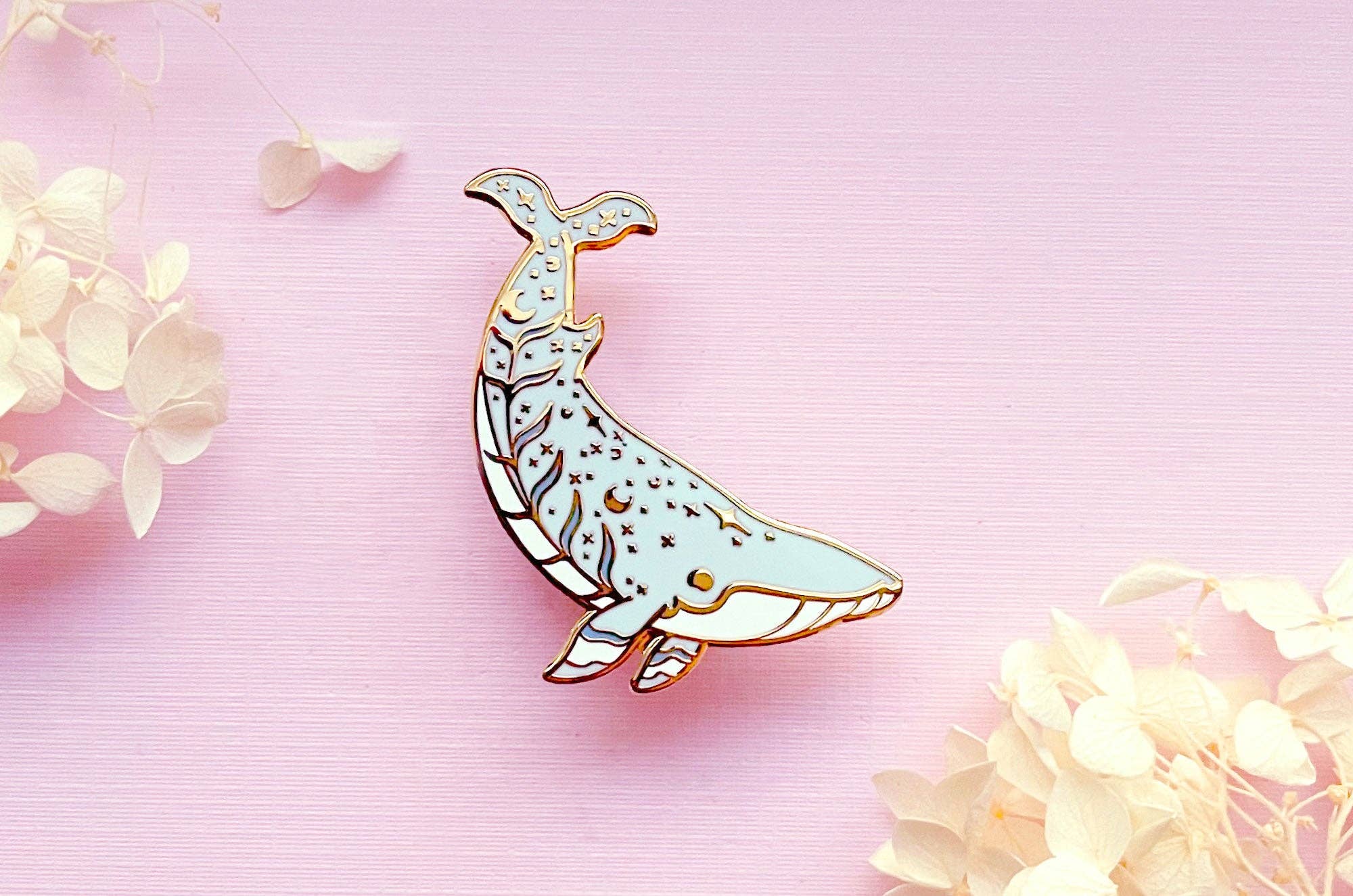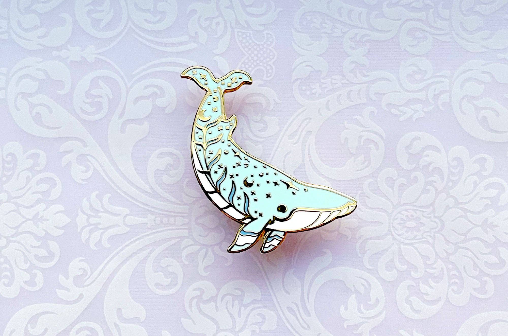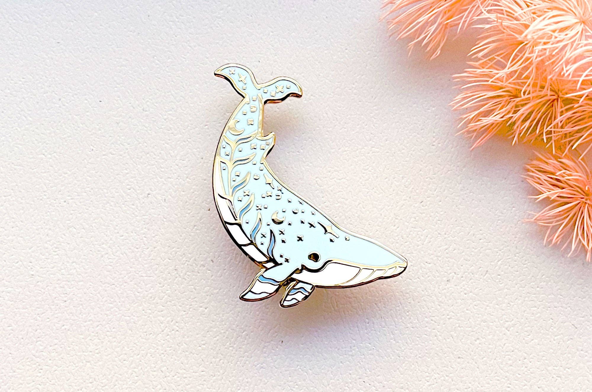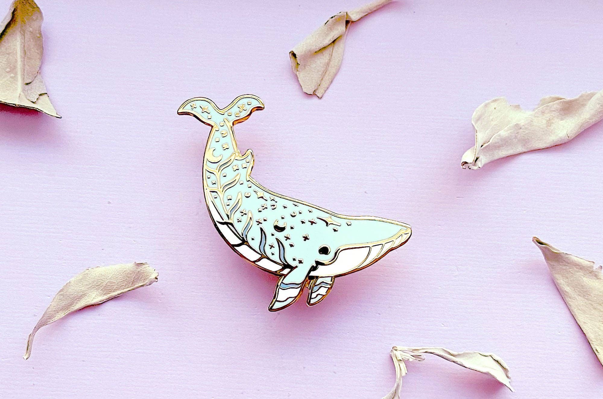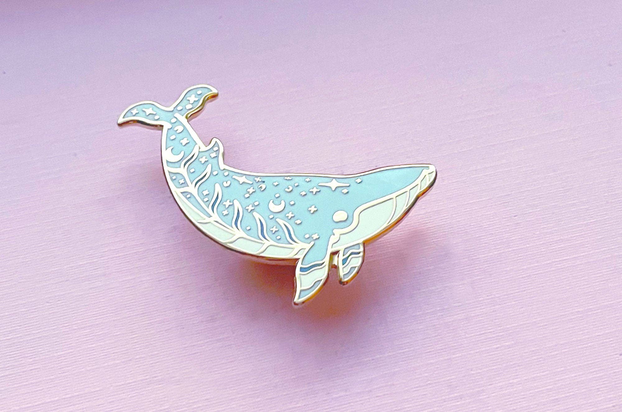 This lovely moon dedication minke whale pin is an homage to the moon and features a cute whale with a kelp tree frond, stars and moons. This hard enamel pin features a color palette of dark blue, light blue and white and is set on a highly-polished gold-plated metal. This pin has two posts on the back it measures approximately 2" in size. THE FEATURES - Highly polished gold-plated metal. - 2″ hard enamel pin. - Has two posts on the back to secure the pin and prevent rotation during wear. - Features dark and light blues with white accents. - The Moon Dedication Minke whale illustration is based on my original artwork. - Stamped with “Alum & Ink” on the back. - Comes mounted on a backing card and packed in a bag for protection. - Photography props and backdrops not included.