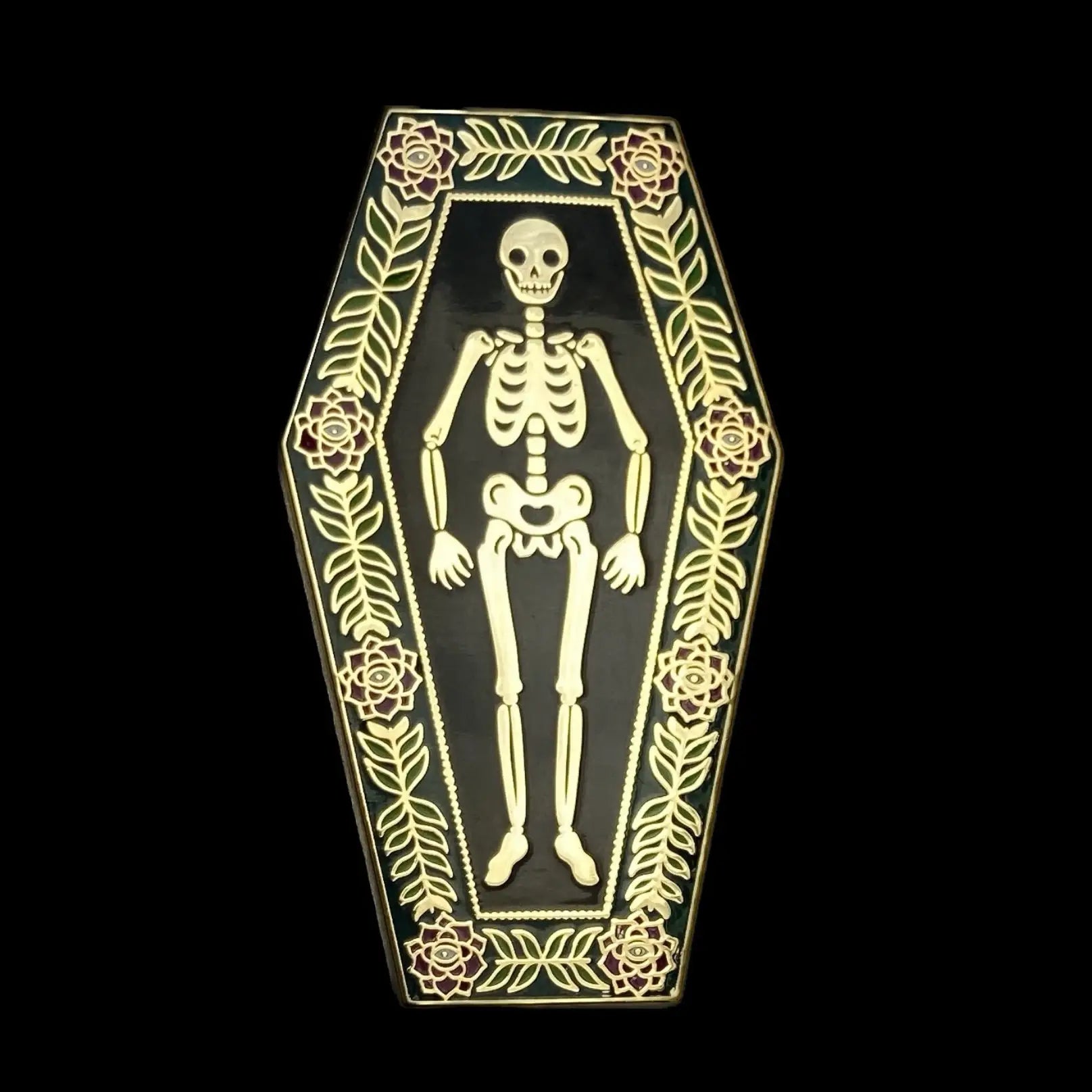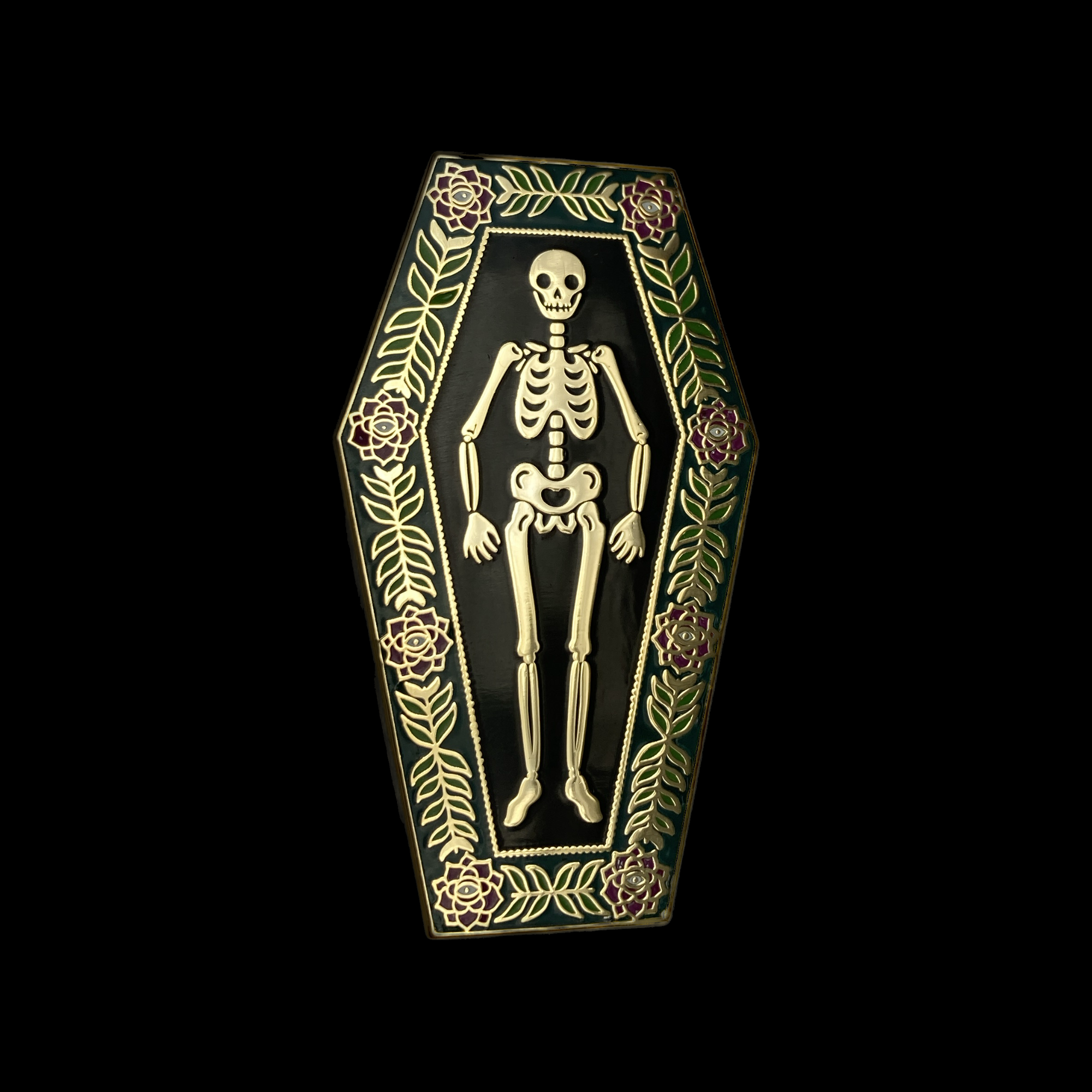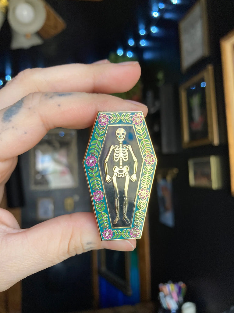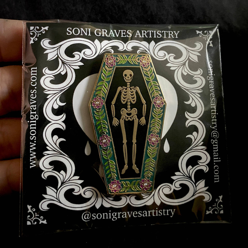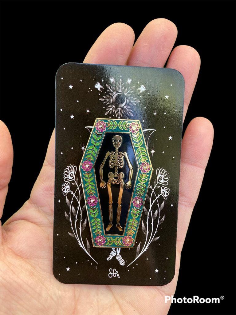 This fantastic little skeleton lies in an ornate coffin made of flowers and vines and is ready to adorn your life. The finish is shiny & eye-catching in the light. Perfect for those who are spooky-year-round. -Measures 1.25 inches wide & 2 inches long -Hard enamel pin with gold colored metal details. -Two pins on back, with rubber pin backs. -Comes packaged individually wrapped, with branded backing inside clear protective sleeve. (Colors may appear differently depending on computer monitors or lighting of photo) Designed by Soni Graves