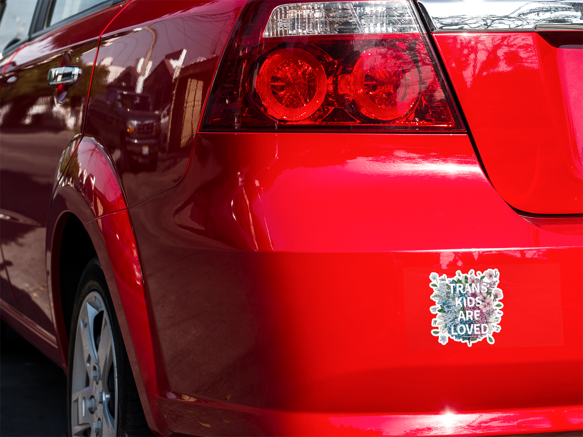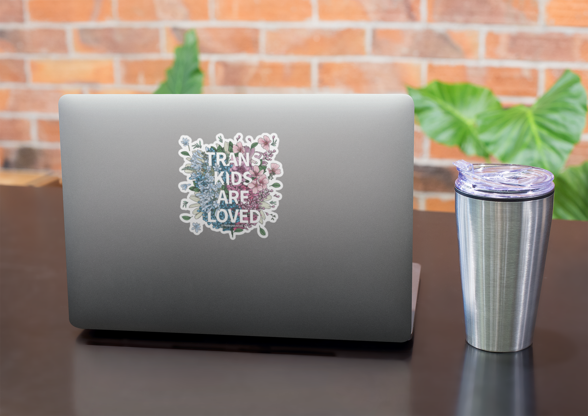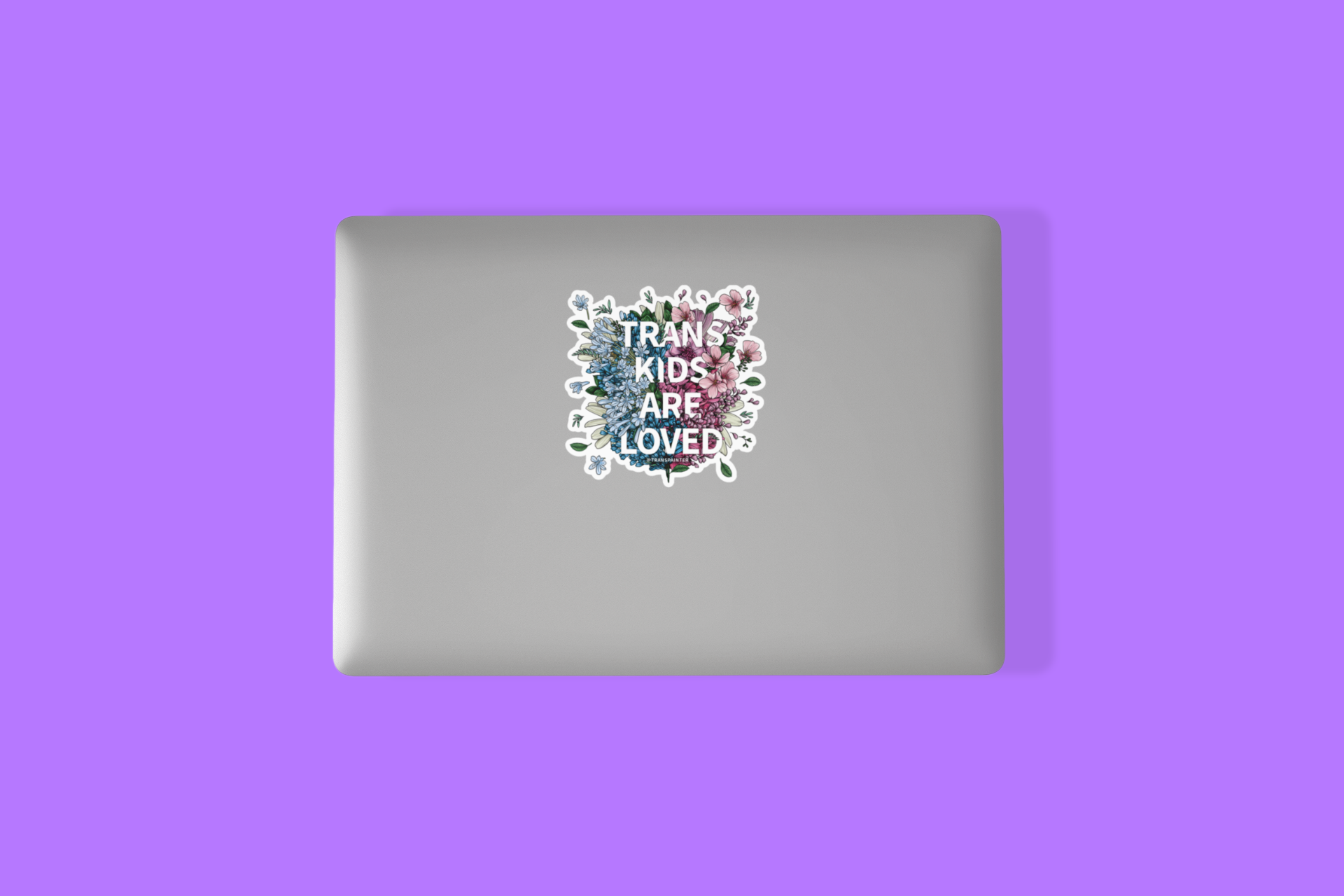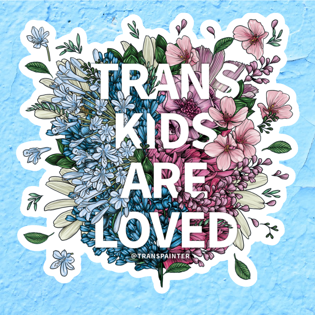 4x4 in bumper sticker art by @transpainter stickers that read "Trans Kids Are Loved" on a die-cut background surrounded by pink, blue and white florals inspired by the Transgender Pride flag. Each sticker is printed on a thick, durable vinyl with a matte finish-giving your stickers a premium look & feel. These are bumper-sticker quality decals that should hold up to the bump and grind of your big beautiful daily life. VINYL BUMPER STICKER DETAILS: + Square: 4x4 in flat vinyl sticker + Rectangle: 4x5 in flat vinyl sticker + Die-Cut: approximately 4x4 in vinyl sticker + Typical full-time outdoor full vibrancy life is 3-9 months (depending on conditions in your location) CARE INSTRUCTIONS: For best results install stickers on clean, dry, flat non-porous surfaces. Store in dry locations out of direct sunlight for longer lasting color. Appreciate the message on this sticker each time you see it. Breathe it in. Then hydrate. Rest. Move your body. Call a friend. Eat something. Shower. Remember you are worthy of