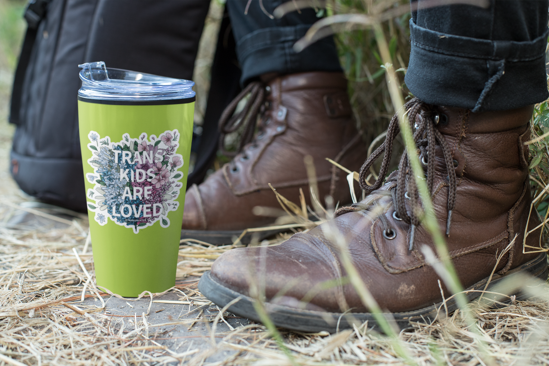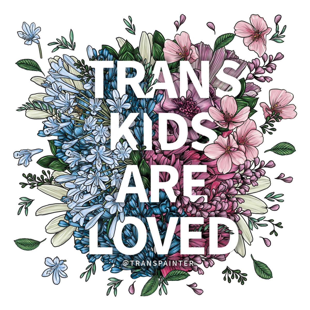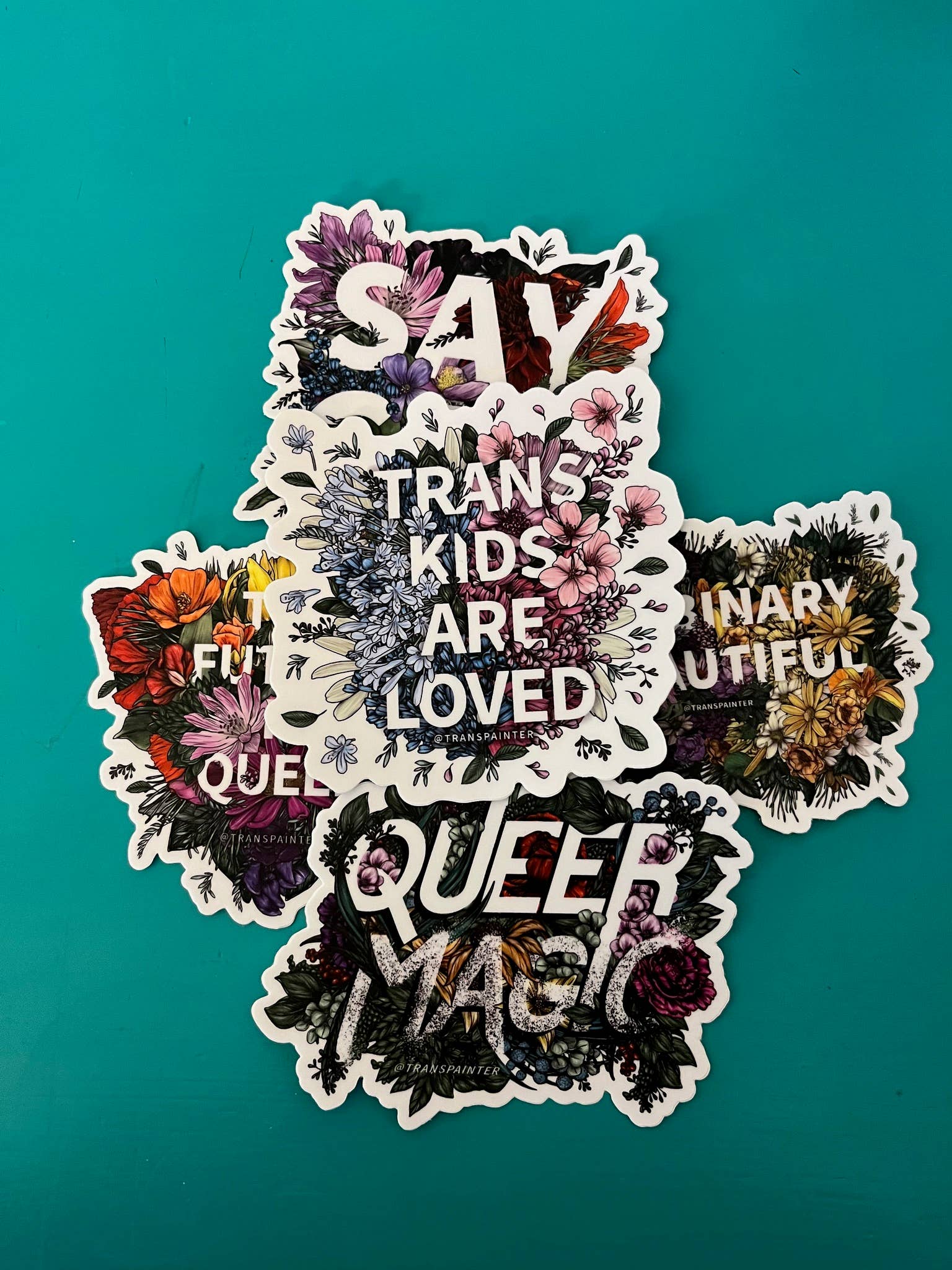 4x4 in bumper sticker art by @transpainter stickers that read "Trans Kids Are Loved" on a die-cut background surrounded by pink, blue and white florals inspired by the Transgender Pride flag. Each sticker is printed on a thick, durable vinyl with a matte finish-giving your stickers a premium look & feel. These are bumper-sticker quality decals that should hold up to the bump and grind of your big beautiful daily life. VINYL BUMPER STICKER DETAILS: + Square: 4x4 in flat vinyl sticker + Rectangle: 4x5 in flat vinyl sticker + Die-Cut: approximately 4x4 in vinyl sticker + Typical full-time outdoor full vibrancy life is 3-9 months (depending on conditions in your location) CARE INSTRUCTIONS: For best results install stickers on clean, dry, flat non-porous surfaces. Store in dry locations out of direct sunlight for longer lasting color. Appreciate the message on this sticker each time you see it. Breathe it in. Then hydrate. Rest. Move your body. Call a friend. Eat something. Shower. Remember you are worthy of