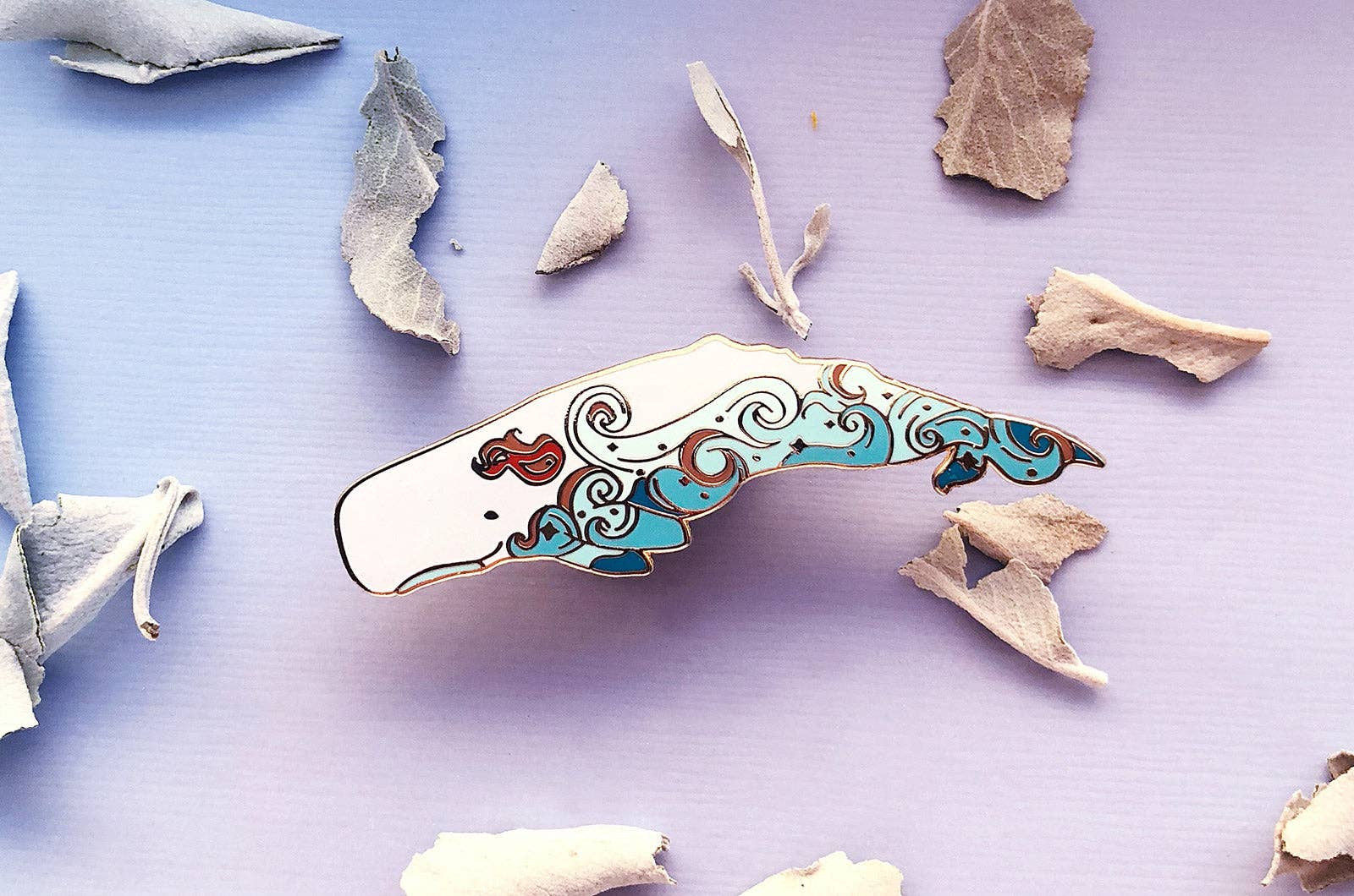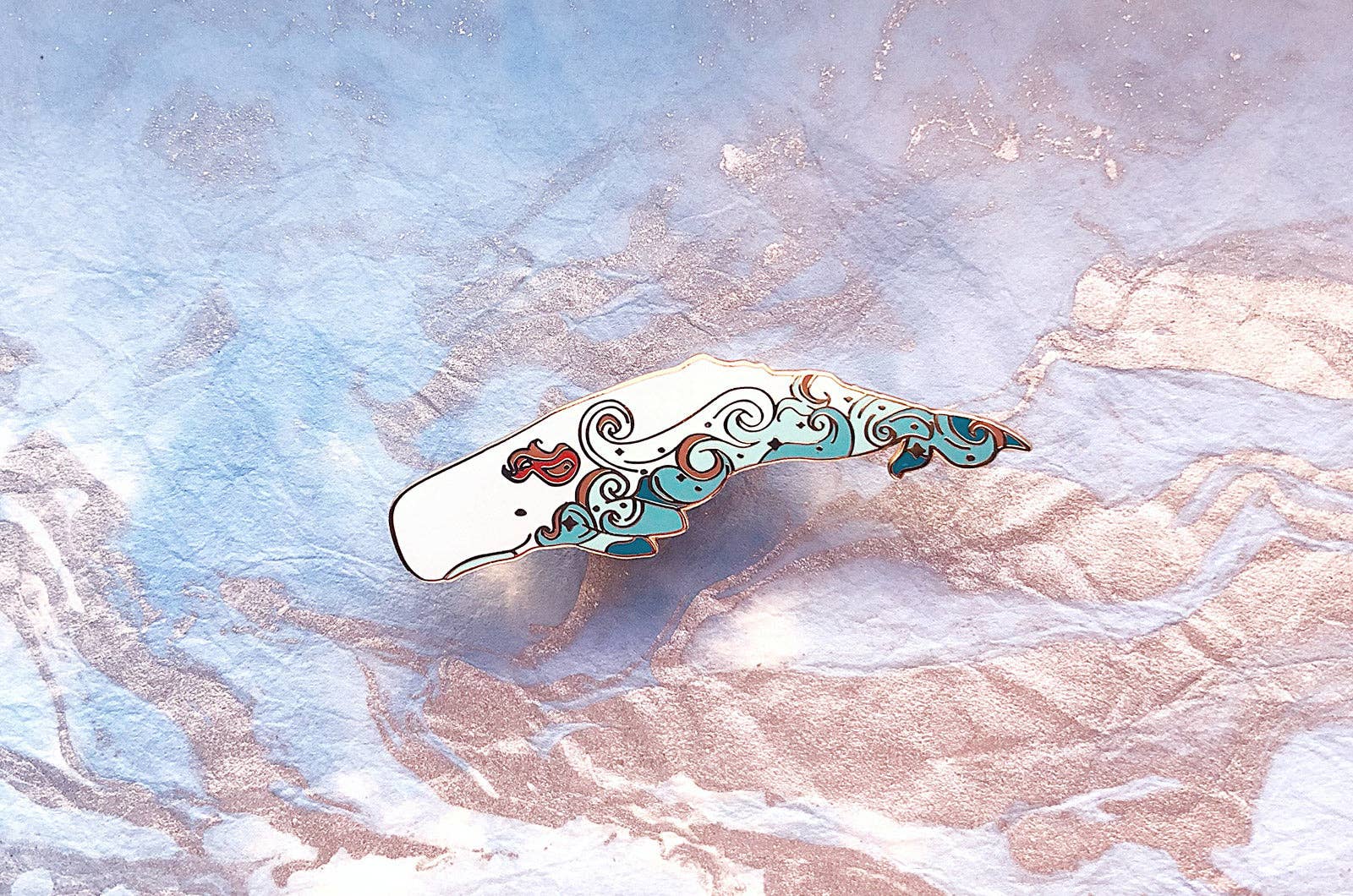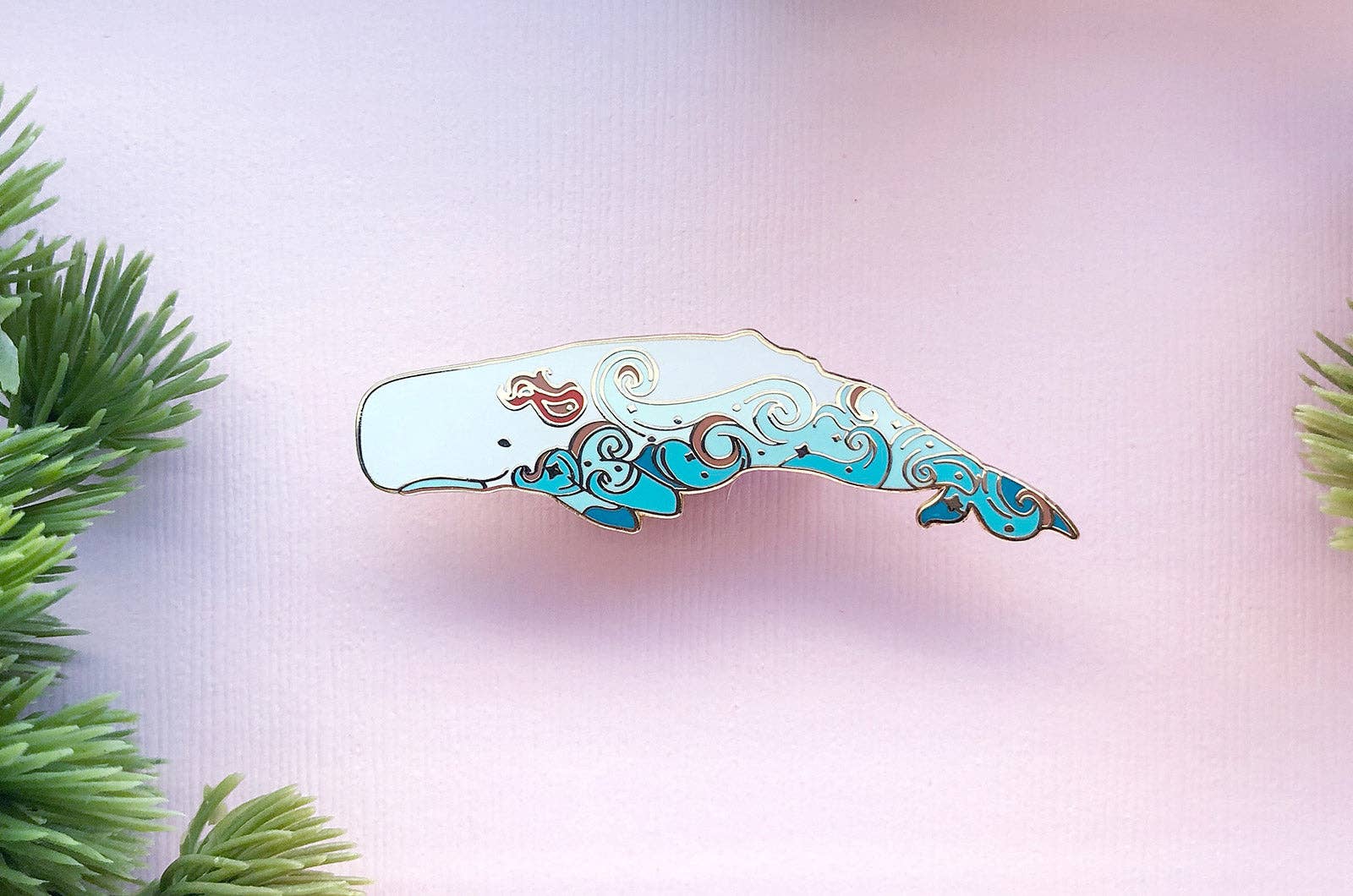 This beautiful waves sperm whale pin features the amazing creature with an ocean surf design and a meteorite falling from the sky. Sperm whales are the ultimate divers of the sea who hunt the mysterious giant squid deep in the waters. The name of this pin is, "Fire in the Sky" featuring a sperm whale with an ocean wave and meteorite design along its body. This is a light gray and turquoise green pin with orange and red accents. This hard enamel pin is set on a highly-polished gold-plated metal. This waves sperm whale pin is large and sized at 2.75″ from end to end.