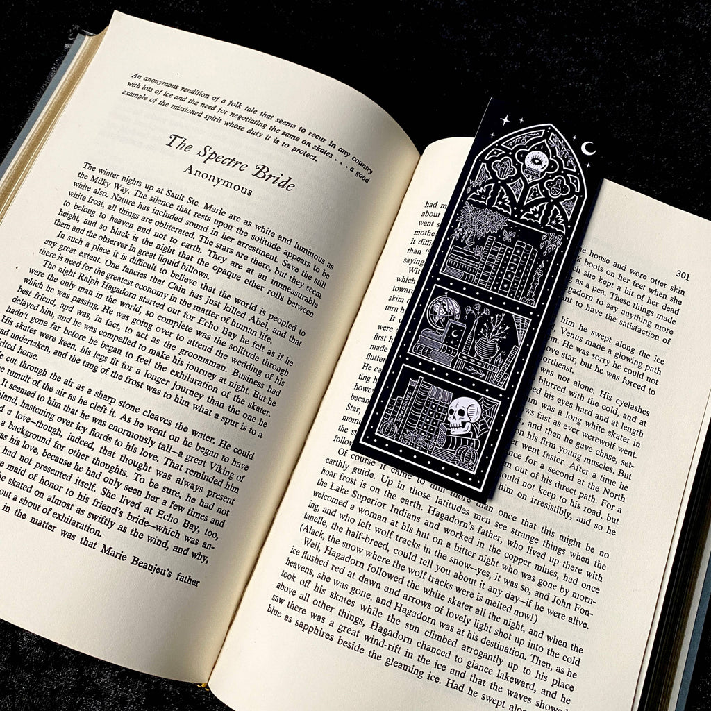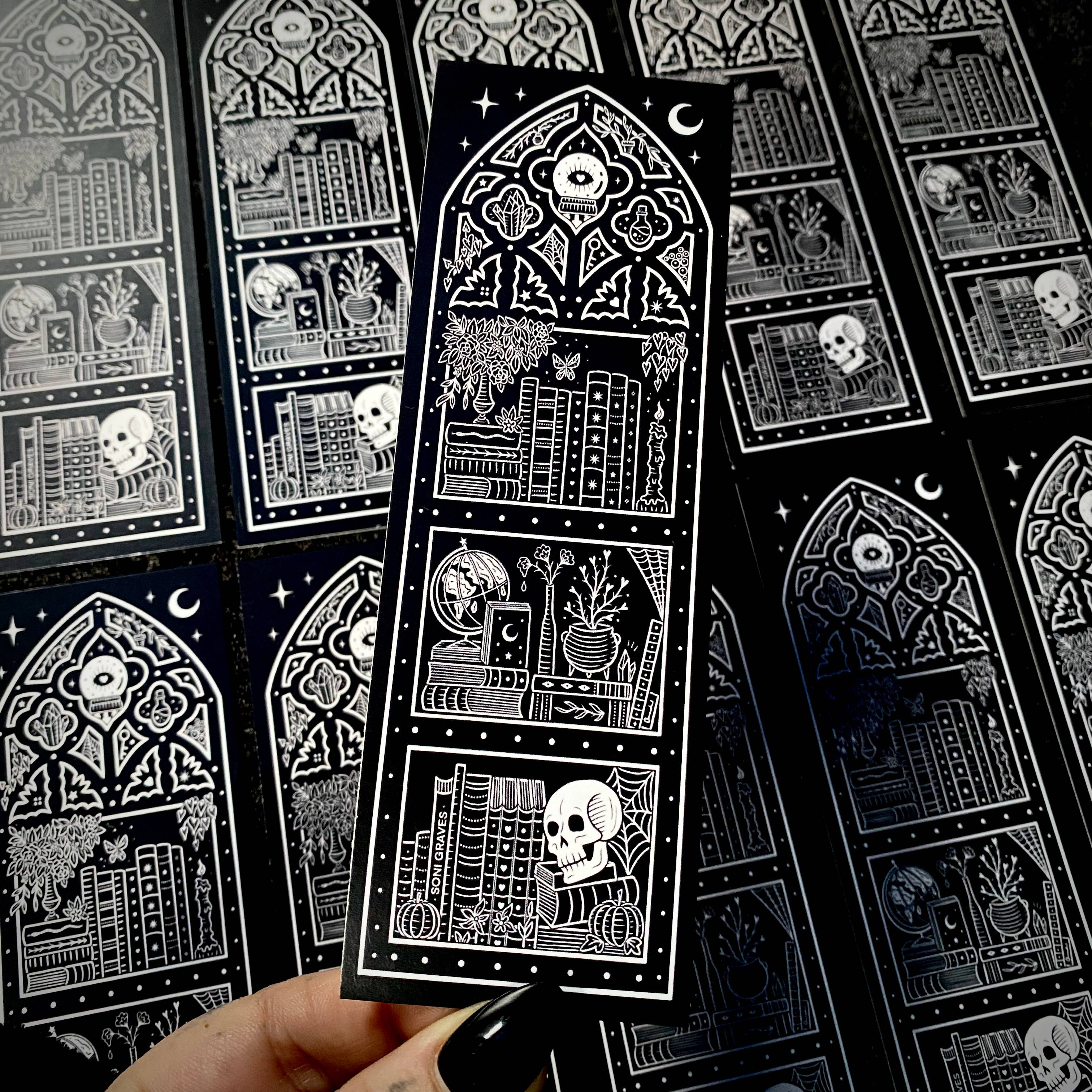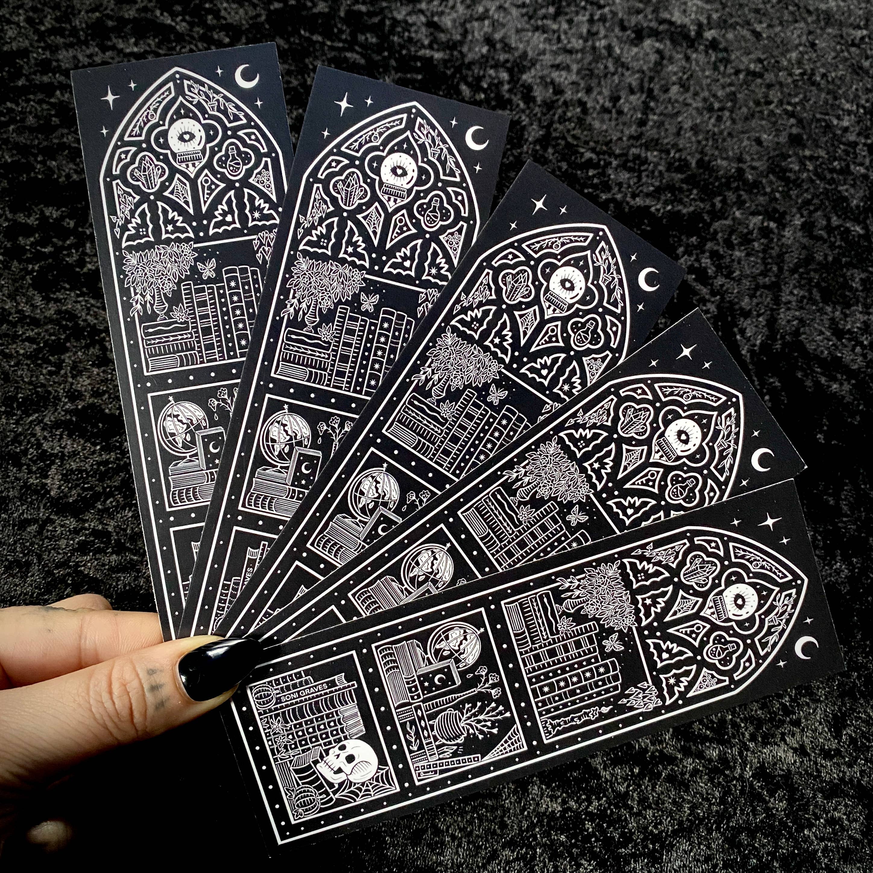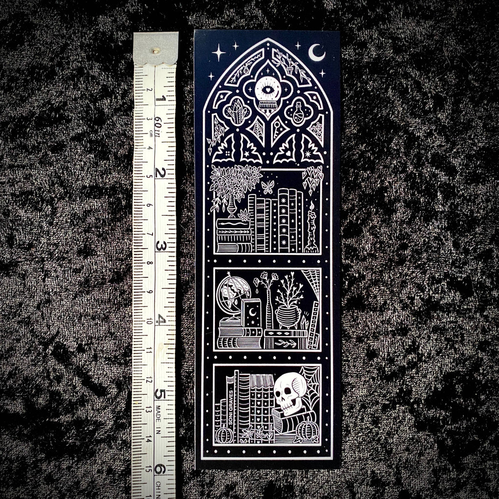 Witchy and whimsical! (1) ONE Double sided bookmark (same design on the front & back). -6 in. x 2 in. -Made from sturdy 14pt. card stock. -Printed and hand cut at home, some slight imperfections are possible. -Original art by Soni Graves This listing is for (1) one handmade bookmark, featuring a witch's bookshelf collection, full of trinkets, knick-knacks, plants, amulets, and spell books (of course). So many nooks and crannies for treasures to hide! Perfect for witchy, book collectors.