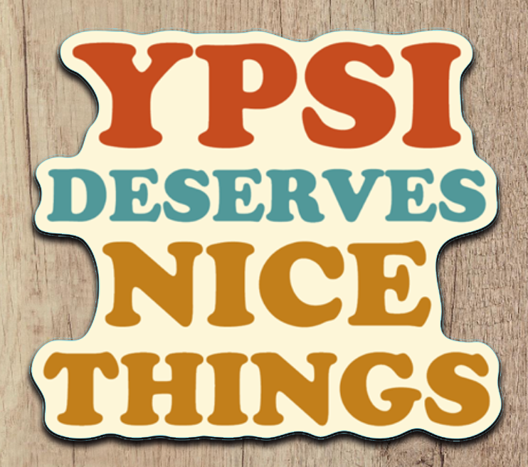 YES, IT DOES! This simple, but meaningful statement says it all. Ypsi (Ypsilanti) is a soulful town, full of incredibly creative, compassionate people who deserve nice things. We're letting the world know that "Ypsi Deserves Nice Things." This dishwasher-proof vinyl sticker measures 3"x2.64" and are printed in Canada (who also deserves nice things).